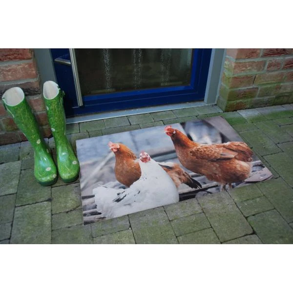 Decoratieve deurmat voor binnen met een prachtige afbeelding van drie mooie legkippen.