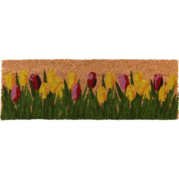 Mooie deurmat gemaakt uit gevlochten kokosvezel voor binnen gebruik. Op deze deurmat word je verwelkomd door een kleurrijk tulpentapijt in roze en gele tinten.
