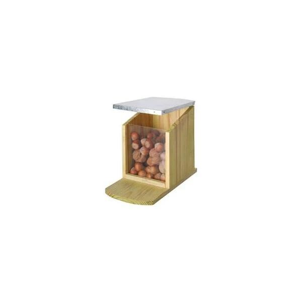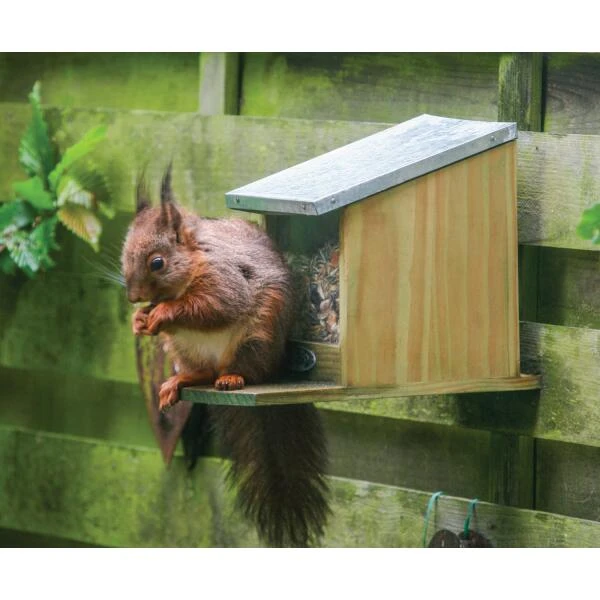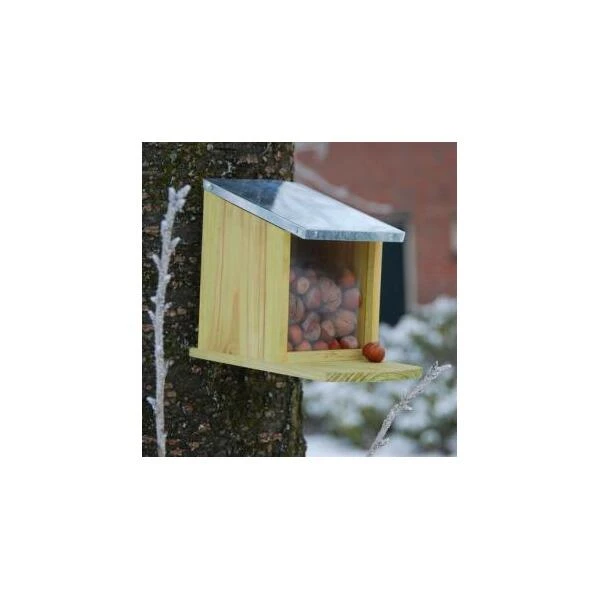 In korte tijd ontdekken ze hoe ze het dakje van het voederhuis kunnen openen om bij het voer te geraken. Bovenal laten de eekhoortjes zich makkelijker observeren wanneer ze aan het eten zijn. Het huisje kun je vullen met allerlei noten, zonnebloempitten of met eekhoorn voedermix