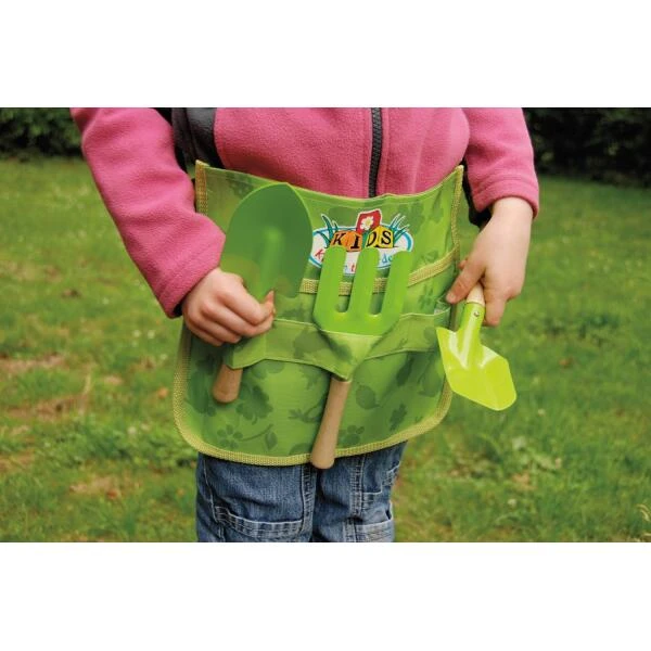 Het setje bestaat uit een gereedschapsgordel met een verstelbare riem, een plantenschopje, een schepje en een vorkje. Zo hebben de kinderen altijd het gereedschap bij de hand. De gordel heeft bovendien een mooie print van dieren en planten: lieveheersbeestjes, vogels, vlinders, eekhoorns, bloemen en egels.
