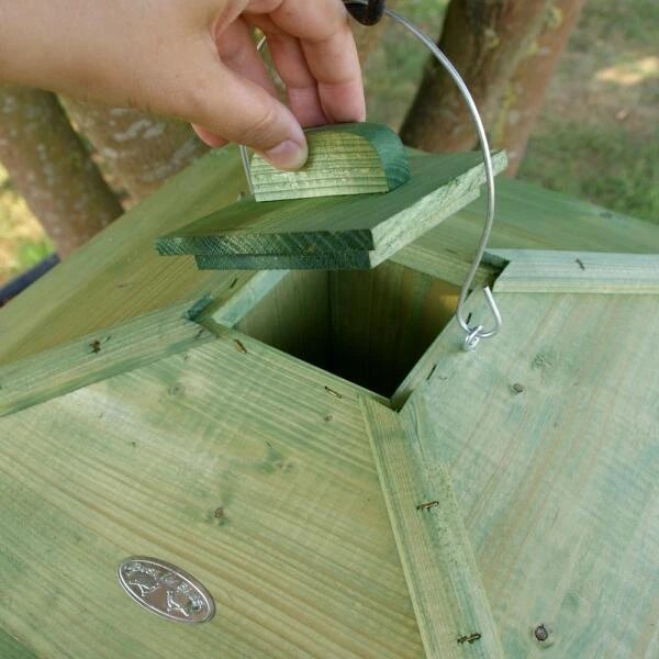 Met dit vogelvoederhuis vertoeven de tuinvogels in Oosterse sferen. Het houten voederhuis met grote onderschaal en afdak biedt plek om 3 soorten vogelvoeder voor te schotelen, het middelste voedervak heeft een voorraadsilo, vlot aan te vullen via een deksel bovenop het huis.