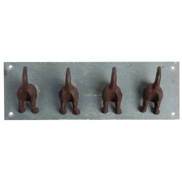 Mooie decoratieve kapstok: 4 gietijzeren hondenstaartjes sieren een mooie leisteen en vormen samen deze mooie klerenhanger!