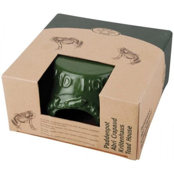 Deze donkergroene paddenpot van keramiek is speciaal gemaakt om nuttige tuindieren zoals padden en kikkers een onderdak te bieden en aan te trekken. In ruil voor de geboden huisvesting zullen de kikkers en padden slakken en schadelijke insecten (wormen, larven, spinnen, kevers, steekmuggen, vliegen, mieren,…) in jouw tuin verorberen. Per dag verorberen ze gemakkelijk 50 insecten.