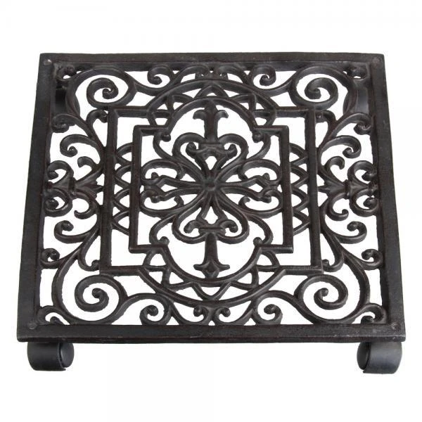 Klassieke victoriaanse vierkante plantentrolley vervaardigd uit gietijzer van 9 mm dik. De plantentrolley is voorzien van 4 wieltjes, waarvan twee met rem en maakt het verzetten van zware bloempotten een gemakkelijke klus.