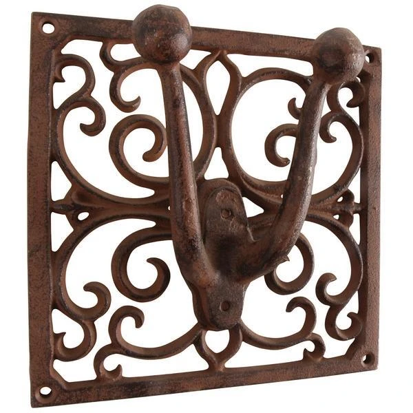 Rustiek bruine gietijzeren tuingereedschaphanger met 2 stevige haken in Victoriaanse stijl.