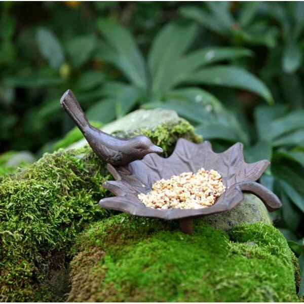 Antiek roestbruine gietijzeren vogelbad in bladmotief met vogel.