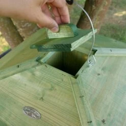 Een appel of vetbol is eenvoudig te vervangen door het pootje aan de onderkant van de pin los te draaien. Merels, lijsters en andere tuinvogels zijn verzot op appels. Vetbollen zijn dan weer zeer geliefd bij allerlei soorten meesjes.