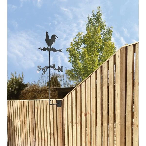 Zwarte metalen windwijzer met een trotse haan. De windhaan kan zo op een muurbeugel of op een tuinprikker en is zeer gemakkelijk te monteren. De hoogte van de windhaan op de prikker is ca. 120 cm.